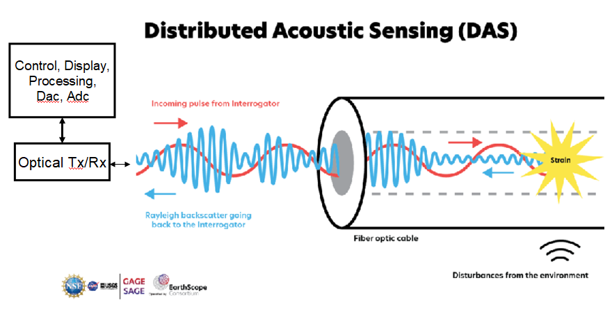 The figure above shows a simple Distributed Acoustic Sensing system. Pulses of light are emitted down the fibre at regular time intervals. The fibre cable is laid where movement is to be detected, eg a perimeter fence, boundary, oil & water pipelines for leaks or interference, seismic sensing etc. Tiny movements in the fibre cause a change in the light that is reflected back from small variations in the refractive index of the fibre.